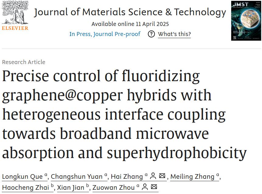 太阳成集团tyc122cc博士生阙龙坤在周祚万教授指导下,提出一种基于石墨烯氟化异质界面精准调控策略,同时实现杂化纳米材料高效宽频吸波和超疏水功能。作者在前期提出的前驱体原位分解制备石墨烯包覆通纳米颗粒(GE@Cu,Carbon, 2024, 225: 119121)基础上,通过精确控制石墨烯氟化,调控F-GE@Cu异质界面的功能耦合,实现了纳米材料的宽带微波吸收和超疏水性能。实验和理论研究结果表明,氟化反应显著提升了了材料的阻抗匹配和电磁波损耗;同时,氟化石墨烯壳层结构赋予材料优异的超疏水性(纳米材料水接触角达154°),即使在酸性、碱性和盐溶液等恶劣的水环境中,该杂化纳米材料也能保持稳定结构稳定性和良好电磁波吸收性能。基于电磁参数模拟计算结果显示,3.5mm厚度下氟化纳米材料的反射率衰减可达-53.0dB,有效吸收带宽8.9GHz。相关研究以“Precise control of fluoridizing graphene@copper hybrids with heterogeneous interface coupling towards broadband microwave absorption and superhydrophobicity”为题发表于近期出版的材料科学顶级期刊(中科院一区TOP,中国科技期刊卓越行动计划英文领军期刊)Journal of Materials Science & Technology,2025,238:13-23 (doi.org/10.1016/j.jmst.2025.02.054). 太阳成集团tyc122cc博士研究生阙龙坤为论文第一作者,周祚万教授和张海博士为共同通讯作者。