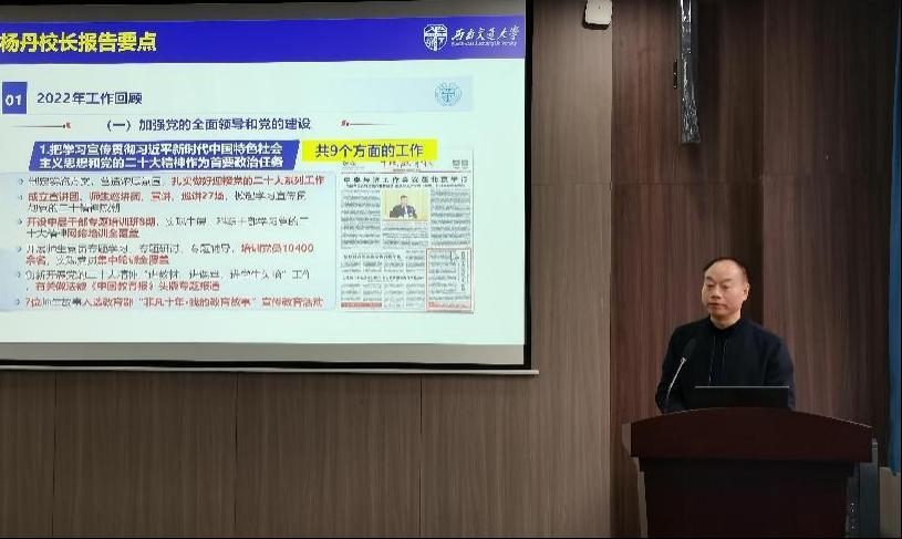 2023年3月2日下午,太阳成集团tyc122cc于九里校区馆外实验室西区C座C103报告厅召开教职工大会。公司经理周祚万、党委副书记张春燕和全体教职工参加会议,会议由张春燕副书记主持。