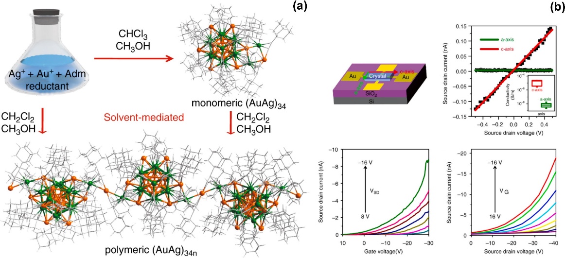 6. 溶剂引发的(AuAg)3₄ 团簇的一维聚合及其导致的各向异性导电性能。