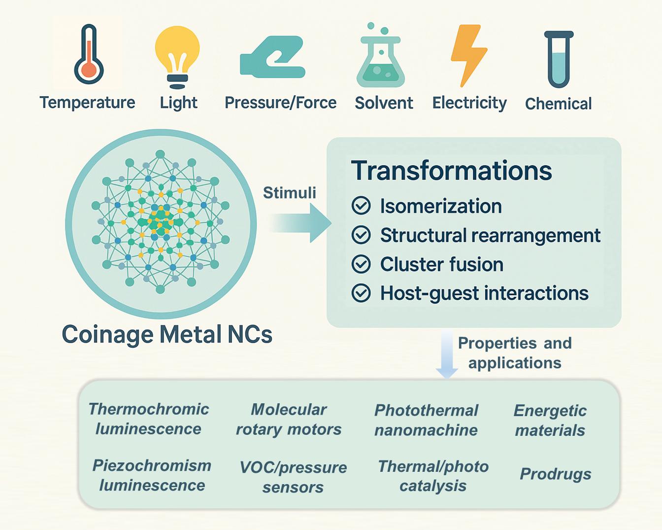 本综述围绕金、银、铜等币族金属纳米簇,详细归纳了其在六类外界刺激(包括温度、光照、压力/机械力、溶剂、化学试剂和电场)作用下的结构演化与性能调控机制。文章重点介绍了诸如热致变色发光、光诱导异构化、压力驱动构型重组以及溶剂诱导自组装等典型实例,突出纳米簇在动态响应过程中的构型可逆性与功能可调性。该综述特别强调原子级精确结构在揭示刺激响应行为机制中的核心作用,并指出多刺激协同响应材料和计算辅助设计在未来研究中的潜力。文章不仅为设计新型智能响应材料提供理论支持,也为自旋电子学、生物传感与前药释放、分子机器等前沿应用拓展提供了新的思路。
