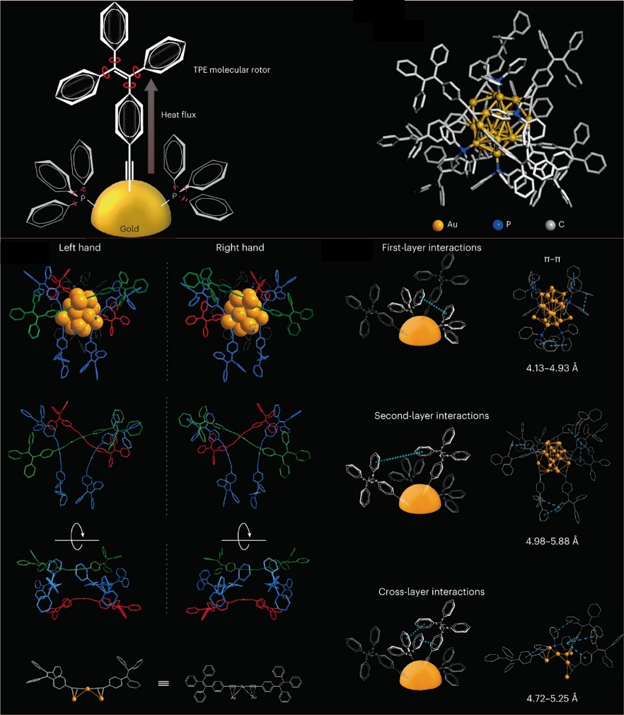 4. 四苯乙烯功能化的Au₂₀团簇应用于光热诊疗;其四苯乙烯单元作为分子马达,通过耗散光热能提升团簇的结构稳定性。