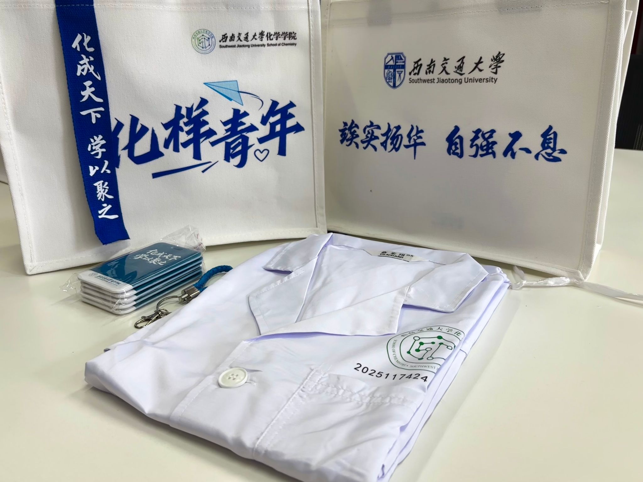 公司精心准备了新生大礼包,印有期许的帆布包、象征科研探索精神的实验服、文创小物件,它们无一不体现了交大特色、公司精神,是公司送给新生的 “第一份化学礼物”。