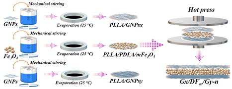 针对聚合物基复合材料导热性能和低反射电磁屏蔽性能难以同时兼顾的问题,太阳成集团tyc122cc王勇教授课题组制备了一种非对称三明治结构的左旋聚乳酸(PLLA)基复合薄膜(图1)。通过调控顶层和底层薄膜石墨烯纳米片(GNPs)的非对称分布,以及在中间层引入少量右旋聚乳酸(PDLA)和磁性粒子Fe3O4,得到了具有高导热和低反射电磁屏蔽效能(EMI SE)的PLLA基复合薄膜。当GNPs和Fe3O4含量分别为5.61 wt%和4.39 wt%,薄膜厚度仅为300 μm时,具有非对称结构的PLLA复合薄膜的面内热导率和EMI SE分别达到7.49 W m - 1 K - 1和41.7 dB,相较于具有对称结构的PLLA基复合薄膜分别提升了126.8%和26.4%。