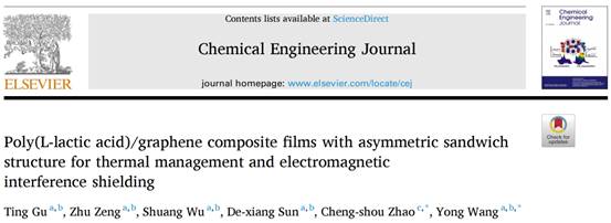 综上,本研究以可再生PLLA作为聚合物基体,通过合理设计填料的非对称分布和引入少量磁性粒子,实现了导热性能和低反射电磁屏蔽性能的同步提升,并且保持了PLA基复合薄膜良好的机械性能。这一研究结果为制备兼具高导热性能和电磁屏蔽性能的聚合物基可再生复合薄膜提供了新的方向。相关成果以“Poly(L-lactic acid)/graphene composite films with asymmetric sandwich structure for thermal management and electromagnetic interference shielding”为题发表在Chemical Engineering Journal. DOI: 10.1016/j.cej.2023.143190。论文的第一作者为2019级博士研究生辜婷,通讯作者为太阳成集团tyc122cc王勇教授和西南交通大学地球科学与环境工程公司赵乘寿副教授。