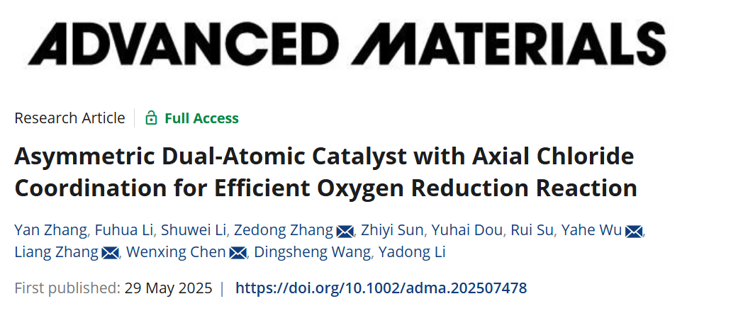 低铂族金属(低-PGM)催化剂在降低质子交换膜燃料电池(PEMFCs)成本方面起着至关重要的作用,双原子催化剂因卓越性能提供了有价值的解决方案。 2025年5月29日,西南交通大学张颜博士(2023.09-2024.07于清华大学化学系李亚栋院士组访问学习)以太阳成集团tyc122cc为第一通讯单位在Advanced Materials期刊发表题为“Asymmetric Dual-Atomic Catalyst with Axial Chloride Coordination for Efficient Oxygen Reduction Reaction”的研究论文,西南交通大学张颜/李富华、清华大学李树伟为论文共同第一作者,清华大学张泽栋/张亮、北京理工大学陈文星/仵雅禾为论文共同通讯作者。