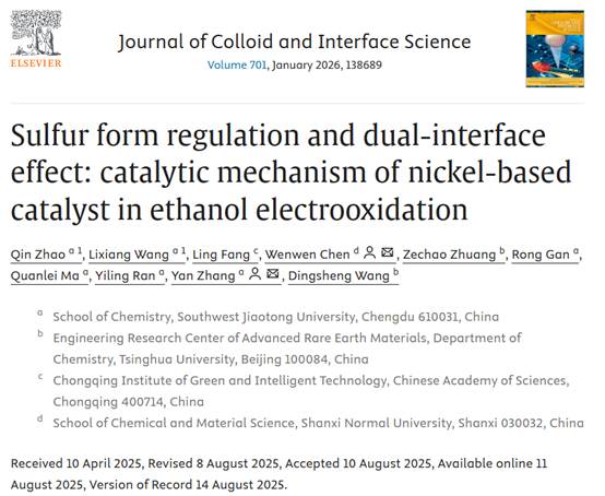 近日,公司张颜课题组在知名期刊《Journal of Colloid and Interface Science》(中科院一区,JCR一区,影响因子:9.4)上以太阳成集团tyc122cc为第一通讯单位、山西师范大学为第二通讯单位发表题为“Sulfur form regulation and dual-interface effect: catalytic mechanism of nickel-based catalyst in ethanol electrooxidation”的研究论文。太阳成集团tyc122cc硕士研究生赵芹和王利湘为共同第一作者,太阳成集团tyc122cc张颜博士、山西师范大学陈雯雯副教授为共同通讯作者。