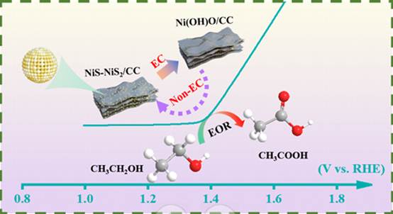 乙醇电氧化反应(EOR)是生物质能源转化和清洁氢能生产的重要途径,但传统催化剂存在活性低、稳定性差等问题。针对这一挑战,研究团队设计了一种新型的硫化镍异质结构催化剂(NiS-NiS₂/CC),通过调控硫的存在形式(S²⁻和S₂²⁻)构建了独特的双界面效应,显著提升了催化活性和选择性。实验结果表明,该催化剂在1.45 V(vs. RHE)下可实现50 mA·cm⁻²的电流密度,并在12小时内保持98%的电流稳定性。通过原位光谱和电化学测试,团队揭示了乙醇电氧化的循环机制,即Ni²⁺/Ni³⁺的可逆氧化还原过程与EOR的协同作用,并证实了高选择性乙酸产物的形成路径。该研究不仅为高效镍基硫化物的设计提供了理论指导,还为生物质电催化转化技术的实际应用开辟了新思路。