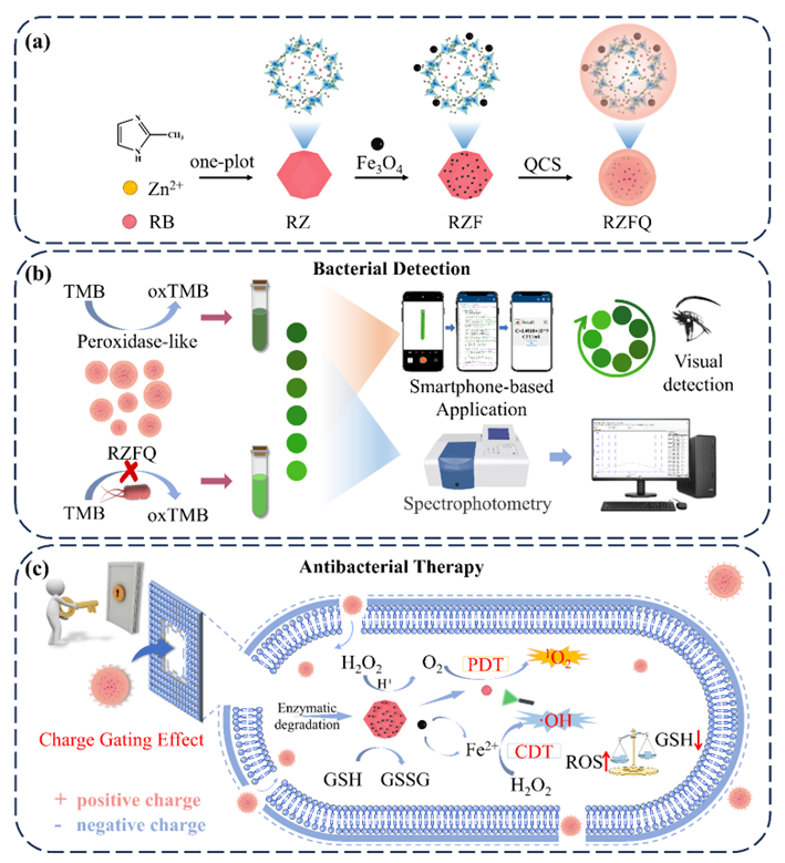 创新性地构建了以壳聚糖季铵盐(QCS)包覆的沸石咪唑框架(ZIF-8)纳米胶囊(RZFQ),实现了细菌检测与抗菌治疗的高效一体化。RZFQ纳米系统利用“电荷门控增强静电靶向”策略,通过带正电的QCS外层与带负电的细菌膜产生强烈的静电作用,显著提高了细菌的捕获效率与靶向识别能力。研究表明,该材料可在10分钟内完成对大肠杆菌和金黄色葡萄球菌的超灵敏检测,检测下限低至约1 CFU/mL,灵敏度与响应速度均优于传统纳米酶体系。