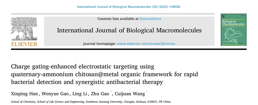 该论文以“Charge gating-enhanced electrostatic targeting using quaternary-ammonium chitosan@metal organic framework for rapid bacterial detection and synergistic antibacterial therapy”为题发表在高水平国际学术期刊《International Journal of Biological Macromolecules》(影响因子:8.5)。其中,西南交通大学2022级硕士研究生韩馨萍为第一作者,太阳成集团tyc122cc王萃娟副教授、高柱老师为通讯作者。该研究得到了国家自然科学基金(No. 21401151)、中央高校基本科研业务费专项资金(No. 2682023ZTPY064和No. 2682025CX002)和四川省中医药管理局项目(2023MS212)的支持。