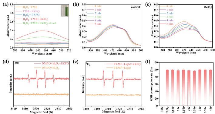 图2:(a)不同体系的紫外-可见光谱和颜色响应数码照片(插图)。不同处理(b: control,c:RZFQ)的DPBF溶液在5分钟内的紫外-可见光谱。(d)∙OH和(e)1O2的EPR谱图。(f)RZFQ在4 h内的GSH消耗能力。