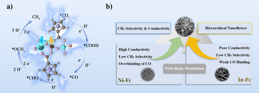 图4. CO2电还原中Ni/In双金属催化剂的结构与组分示意图。(a)Ni5In3-Fc 中 Ni–In位点的电子结构与反应路径构型。(颜色标注:紫色球=Fe,棕色球=In,绿色球=Ni,粉红色球=O,深灰色球=C,浅灰色球=H。)(b)不同 Ni/In 比下的催化剂形貌变化及反应性能调控。