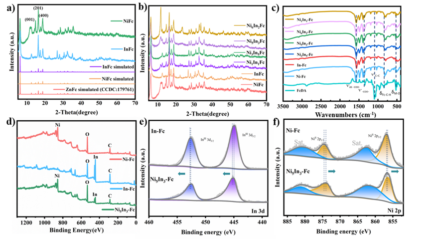 图2.(a,b)不同Ni/In比下In-Fc、Ni-Fc与NixIny-Fc样品的粉末X射线衍射(PXRD)图谱;(c)傅里叶变换红外(FTIR)光谱;(d)Ni-Fc、In-Fc与Ni5In3-Fc的XPS总谱;(e)In 3d 谱与(f)Ni 2p 谱。
