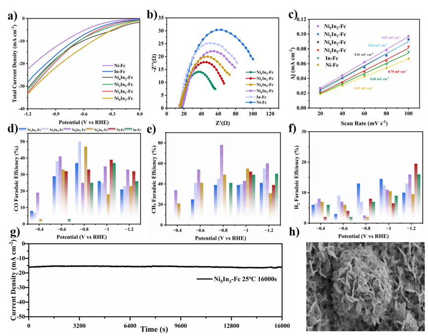 图3.NixIny-Fc的(a)线性扫描伏安(LSV)曲线;(b)Nyquist图(EIS);(c)电流密度与扫描速率关系的线性拟合;CO₂RR性能:(d)CO的法拉第效率,(e)CH4的法拉第效率,(f)H2的法拉第效率;(g)Ni5In3-Fc在 −0.8 V vs RHE下16,000 s恒电位稳定性测试;(h)CO2RR 反应后 Ni5In3-Fc的SEM图像。