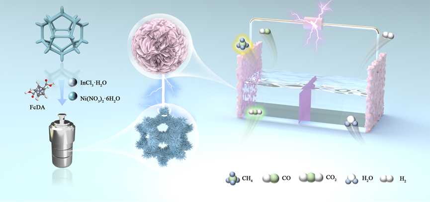 综上所述,本研究提出了“双金属调控+配体工程+结构精控”的一体化设计路线:以二茂铁配体调谐活性位电子结构,以Ni/In比控制实现构型与能带的匹配,以纳米花形貌提供高效传质与高密度暴露位点。在兼顾性能与高稳定性的前提下,为CO2电还原制CH4的高性能MOF催化剂提供了设计思路与机理依据。展望未来,可结合电解槽工程化与同位素示踪,量化界面动力学与中间体演化,并探索更宽电位窗口、更高电流密度的放大应用。