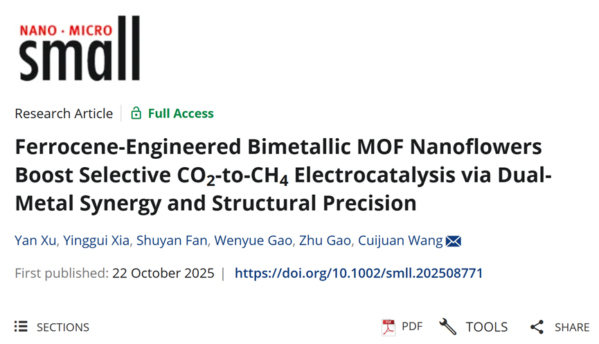 该论文以“Ferrocene-Engineered Bimetallic MOF Nanoflowers Boost Selective CO2-to-CH4 Electrocatalysis via Dual-Metal Synergy and Structural Precision” 为题发表国际知名期刊《Small》上。其中,太阳成集团tyc122cc2023级硕士研究生许滟为第一作者,太阳成集团tyc122cc王萃娟副教授为通讯作者。本研究得到国家自然科学基金(No. 21401151);中央高校基本科研业务费(No. 2682023ZTPY064,No. 2682025CX002);四川省中医药管理局项目(No. 2023MS212)的支持。