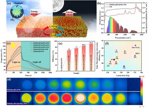 图5 (a) 相变复合材料的太阳能转换和储存行为机理示意图;(b) PW和PDMS/BN20/PPy/PW的紫外-可见-近红外吸收光谱;(c) PDMS/BN/PW和PDMS/BNx/PPy/PW的温度-时间曲线、(d)红外热成像和(e)太阳-热能转换效率;(f) 与相关研究相比的太阳热能转换效率和潜热