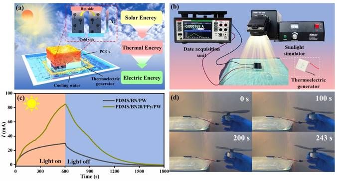 图6 STEEC系统的(a)原理图和(b)实物图;(c) PDMS/BN/PW和PDMS/BN20/PPy/PW的I-t曲线;(d) STEEC应用实验数码照片