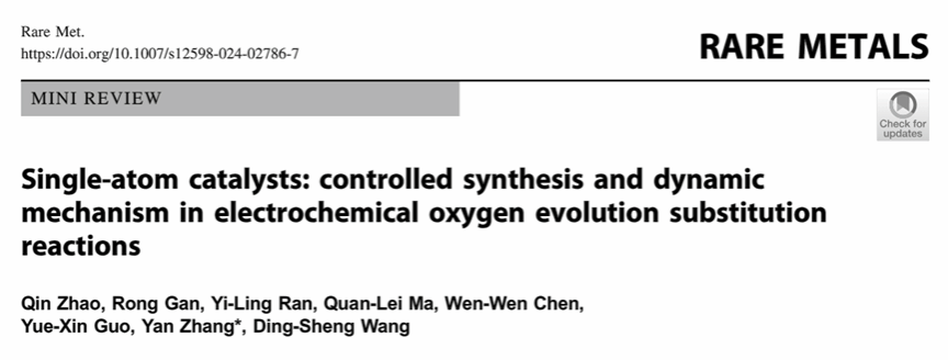 近日,公司张颜团队在清华大学王定胜教授的指导下在知名期刊《Rare Metals》(中科院一区,影响因子:8.8)上以太阳成集团tyc122cc为第一通讯单位、清华大学为第二通讯单位发表题为“Single-atom catalysts: controlled synthesis and dynamic mechanism in electrochemical oxygen evolution substitution reactions”的综述。其中太阳成集团tyc122cc2022级硕士研究生赵芹、甘蓉为共同第一作者,清华大学王定胜教授作为共同作者,太阳成集团tyc122cc张颜博士为通讯作者。