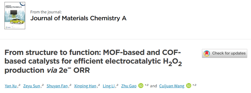 该综述以“From structure to function: MOF-based and COF-based catalysts for efficient electrocatalytic H2O2 production via 2e− ORR” 为题发表在材料类国际顶级期刊《Journal of Materials Chemistry A》(影响因子:10.7)。其中,太阳成集团tyc122cc2023级硕士研究生许滟为第一作者,太阳成集团tyc122cc高柱助理教授,王萃娟副教授为通讯作者。该研究得到了国家自然科学基金(No. 21401151)、中央高校基本科研业务费专项资金(No. 2682023ZTPY064)和四川省中医药管理局项目(No. Q115723S02001)的支持。