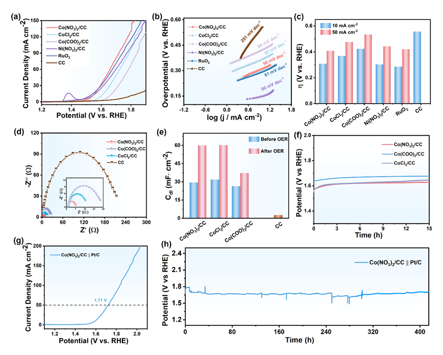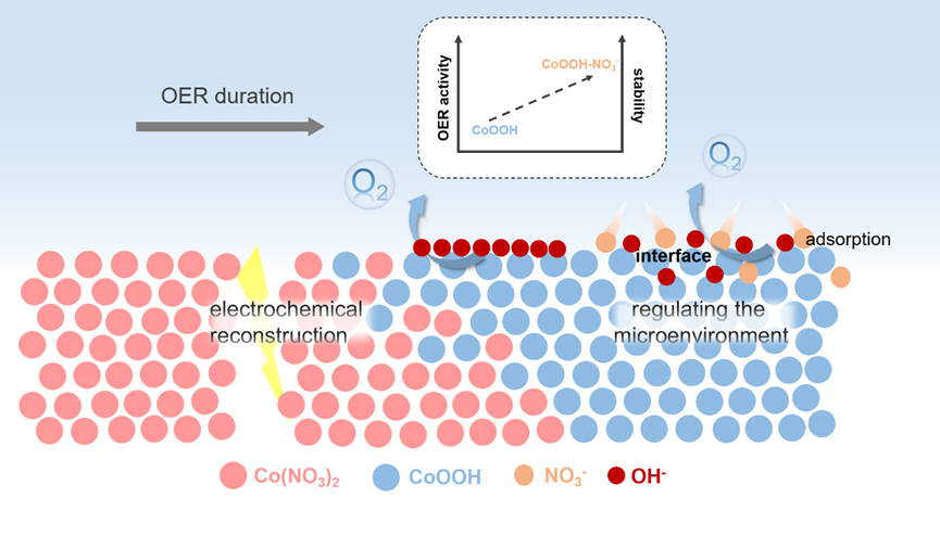 在这项工作中,作者利用一步电化学重构的方法得到催化剂CoOOH-NO3-,这是因为在电化学过程伴随着原料中的阴离子吸附在CoOOH上,进而通过吸附的阴离子调控界面微环境来促进OER。究其原因,是因为吸附阴离子后可改善CoOOH内紧密层OH-过渡吸附问题,使活性位点更易枝接OH-,从而调节界面微环境。通过一系列实验验证了界面微环境得到调控,如电极表面接触角变小易于O2释放解析,促进Co向高价态转变和降低反应发生起始电位。此外,一步合成方法与微环境调控策略在多种金属盐中(氯盐,醋酸盐)都是适用的。这项工作为直接利用金属盐提供了一种非化学合成的简便方法,为理解阴离子吸附调控微环境进而提升催化活性提供合理的思路和线索。