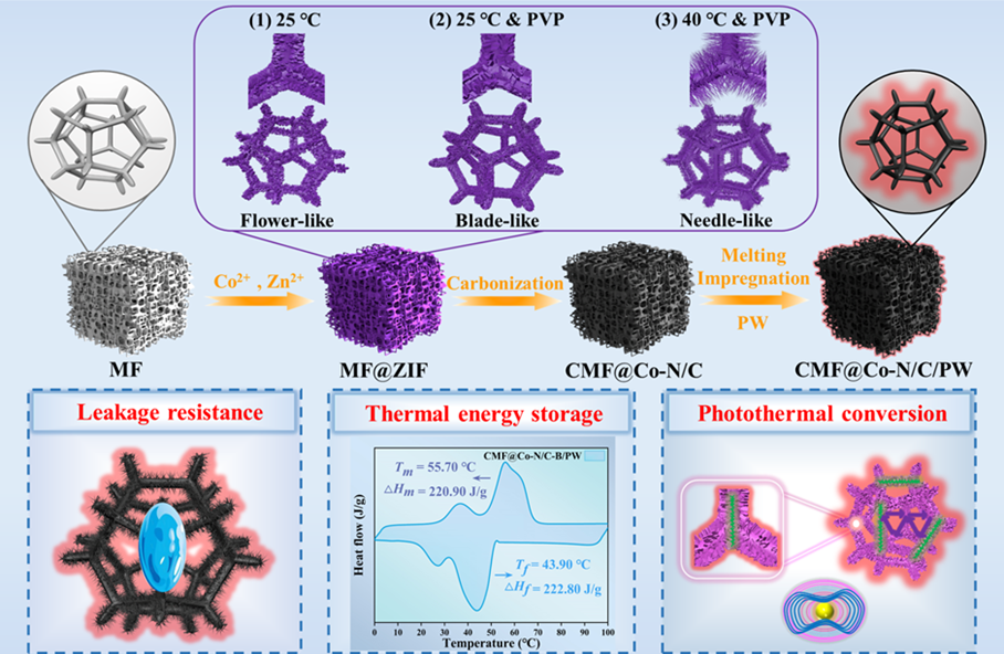 图1. CMF@Co-N/C/PW复合PCMs的合成示意图。由于CMF@Co-N/C多级孔碳泡沫,复合PCMs具有良好的封装性能、热能储存和光热转换性能。