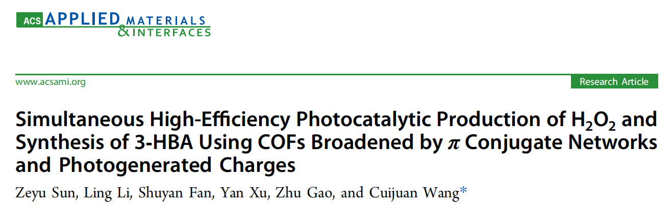 该论文以“Simultaneous High-Efficiency Photocatalytic Production of H₂O₂ and Synthesis of 3-HBA Using COFs broadened by π conjugate network and Photo-Generated Charges”为题发表在材料类国际顶级期刊《ACS Applied Materials & Interfaces》(影响因子:8.3)。其中,2022级硕士研究生孙泽宇为第一作者,太阳成集团tyc122cc王萃娟副教授为通讯作者。该研究得到了国家自然科学基金(No. 21401151)、中央高校基本科研业务费专项资金(No. 2682023ZTPY064和No. 2682025CX002)和四川省中医药管理局项目(2023MS212)的支持。