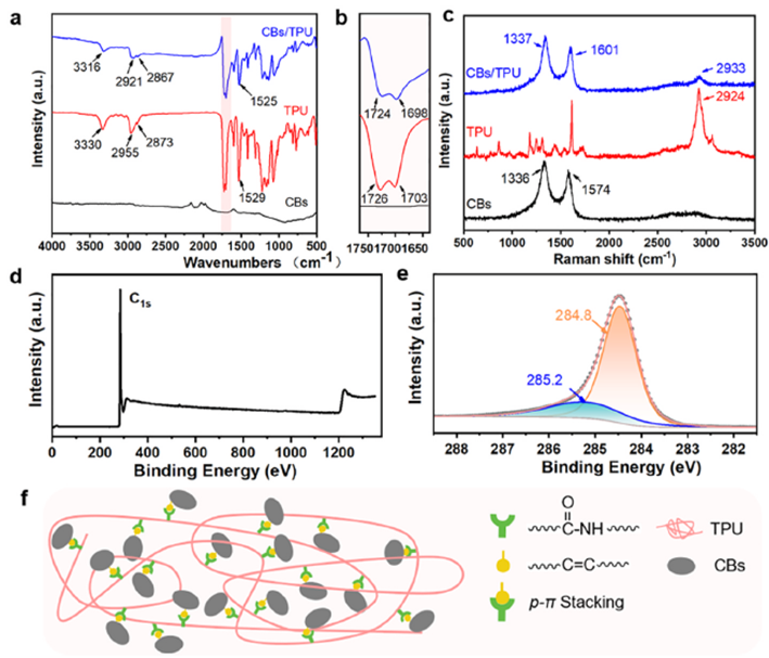 图2 CBs,TPU和CBs/TPU复合纤维的结构表征及其相互作用示意图。a,CBs,TPU和CBs/TPU纤维的红外光谱图,b,a中标记区域的放大图;c,CBs,TPU和CBs/TPU复合纤维的拉曼光谱图;d,CBs的XPS全谱图,e,C1s高分辨扫描谱图;f,CBs/TPU纤维内部CBs和TPU之间相互作用的示意图。