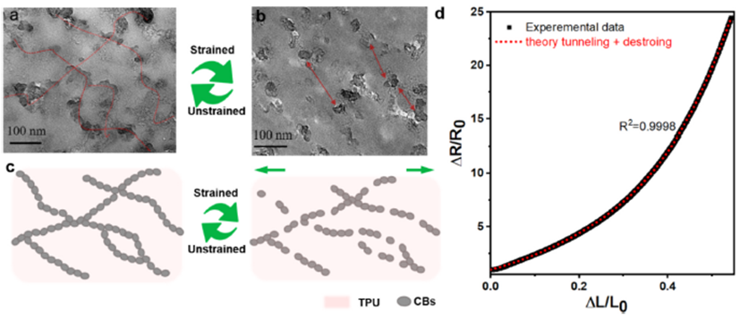导电聚合物复合材料的电阻响应行为与导电网络结构的变形密切相关。研究结果表明,相邻的CBs颗粒随着逐渐增加的应变相互分离,导电路径被破坏,导致电阻增加。同时,距离较近的CBs粒子间可能产生隧穿电阻,隧穿电阻值随应变增加而增大。