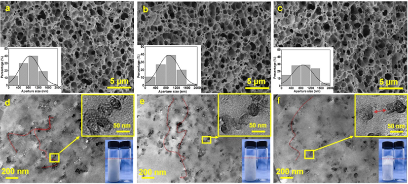 溶剂冻胀导致孔隙膨胀,可以用来调控CBs形成的导电网络结构。图3d-f中的插图(右下)显示了混合溶剂在冷冻后的体积膨胀率。纯水(图3f右下角所示)的体积膨胀率最大。随着混合溶剂中乙醇含量的增加,体积膨胀率降低。当乙醇与水的比例为3:7时,混合溶剂在冷冻过程中体积变化不大。所获得的纤维的截面SEM图像如图3a-c所示。图3a-c中的插图显示SEM图中的孔径分布。随着乙醇含量的减少,纤维的孔径增大。同时,图3d-f的TEM图显示冻胀率小的混合溶剂制备的纤维中,CBs紧密堆积导致的过多导电路径。随着溶剂混合物冻胀率的增加,这些紧密堆积的纳米颗粒逐渐相互分离(见图3d-f)。实验结果表明,乙醇/水体积比为1:9的混合溶剂具有合适的冻胀比,可驱动临界导电网络结构的形成。