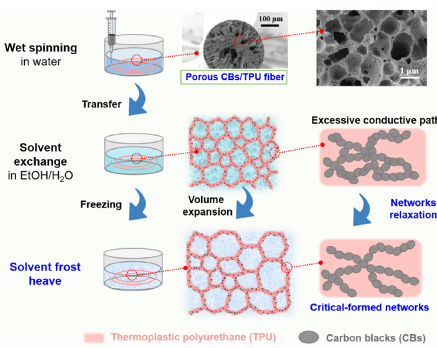 该工作以“Solvent frost heave-driven relaxation of conductive network in carbon blacks/polyurethane fibers towards highly sensitive sensor”为题目发表于《Composites Science and Technology》。论文第一作者为太阳成集团tyc122cc博士生代明凤,太阳成集团tyc122cc经理周祚万教授团队的博士后郭一帆为通讯作者,通讯单位为西南交通大学。