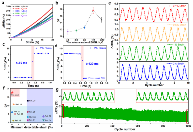 图4 具有临界导电网络结构的CBs/TPU纤维的应变—电阻响应特性。(a)在微小应变下纤维的应变-电阻响应曲线。(b)响应灵敏度因子(GF)。(c)响应和(d)恢复时间。(e)在0.1%、0.5%、1%和2%的微小应变下循环拉伸-释放的响应曲线。(f)已报道的基于导电填料的电阻型应变传感器在0~20%应变下的GF和检测限。(g)1000次以上的循环稳定性测试。