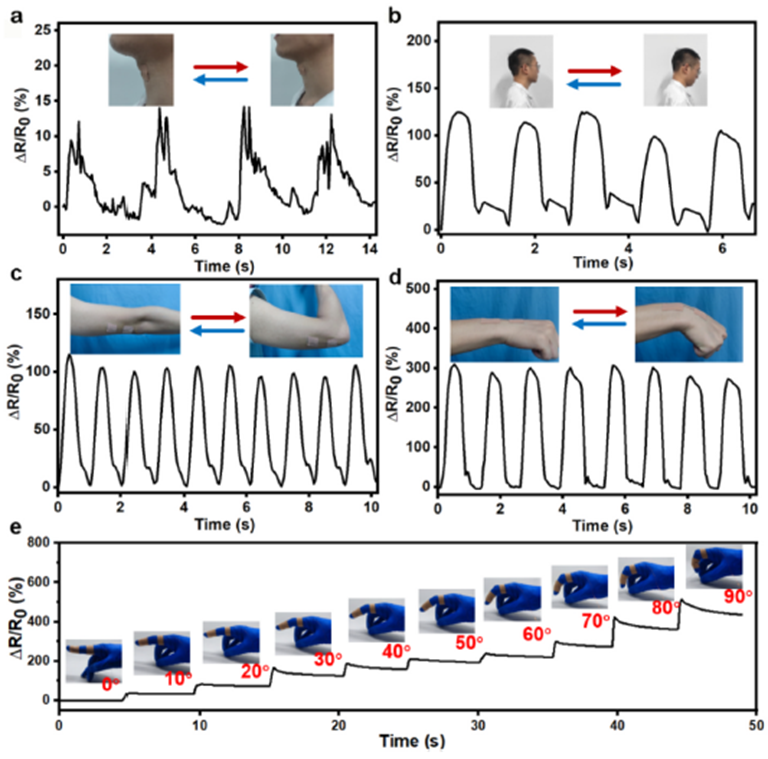 图6 CBs/TPU纤维监测人体运动的电阻响应曲线。(a)监测吞咽行为。(b)监测点头时颈部肌肉运动。(c)监测肘部弯曲运动时肌肉收缩和松弛。(d)监测腕关节运动。(e)监测手指从0到大90°不同角度弯曲运动。