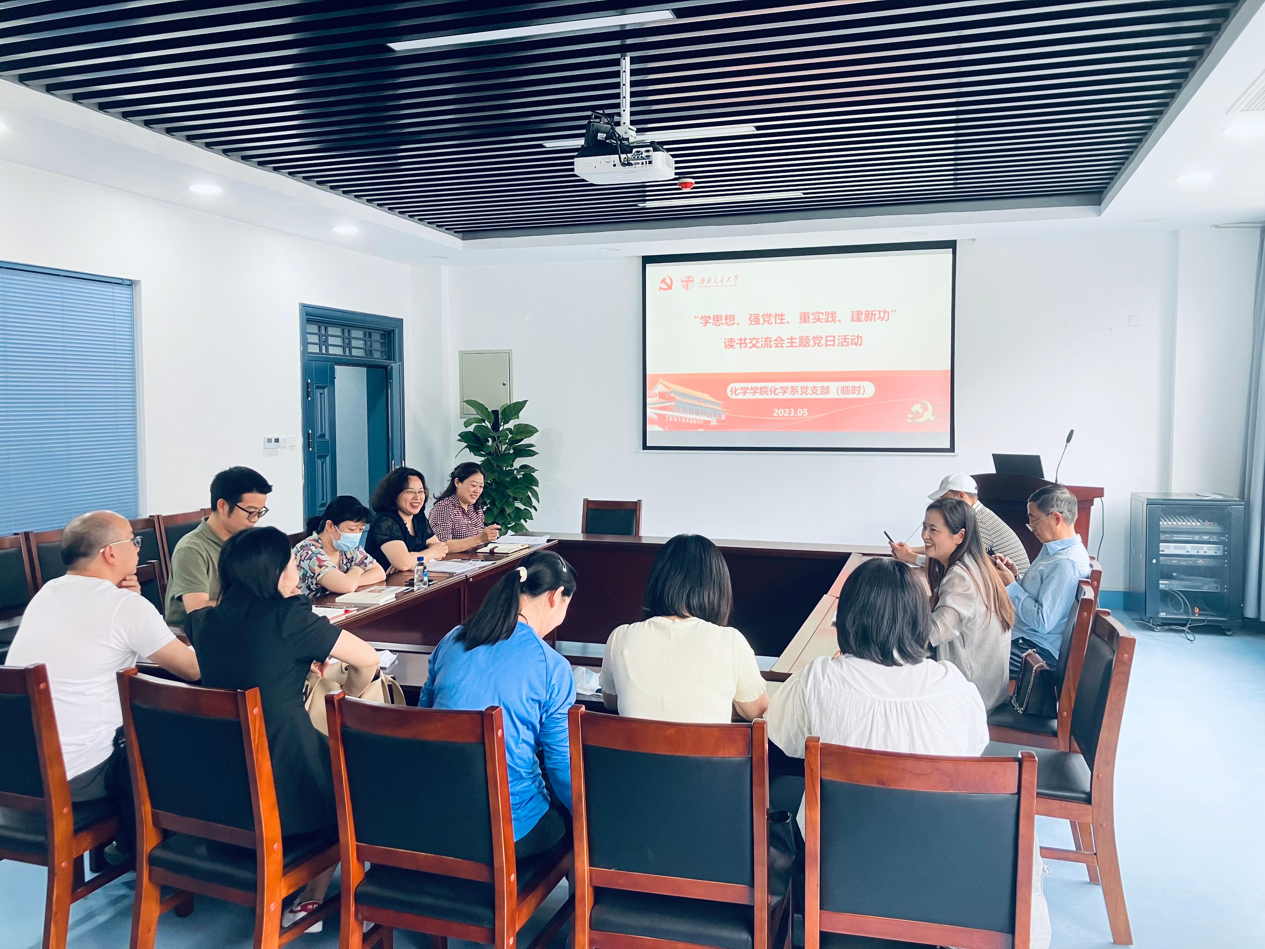 为深入开展学习贯彻习近平新时代中国特色社会主义思想主题教育工作,2023年5月25日下午,太阳成集团tyc122cc化学系教工党支部于九里校区工业中心C座C203报告厅开展“学思想、强党性、重实践、建新功”读书交流会主题党日活动。本次活动由郑剑峰同志主持。