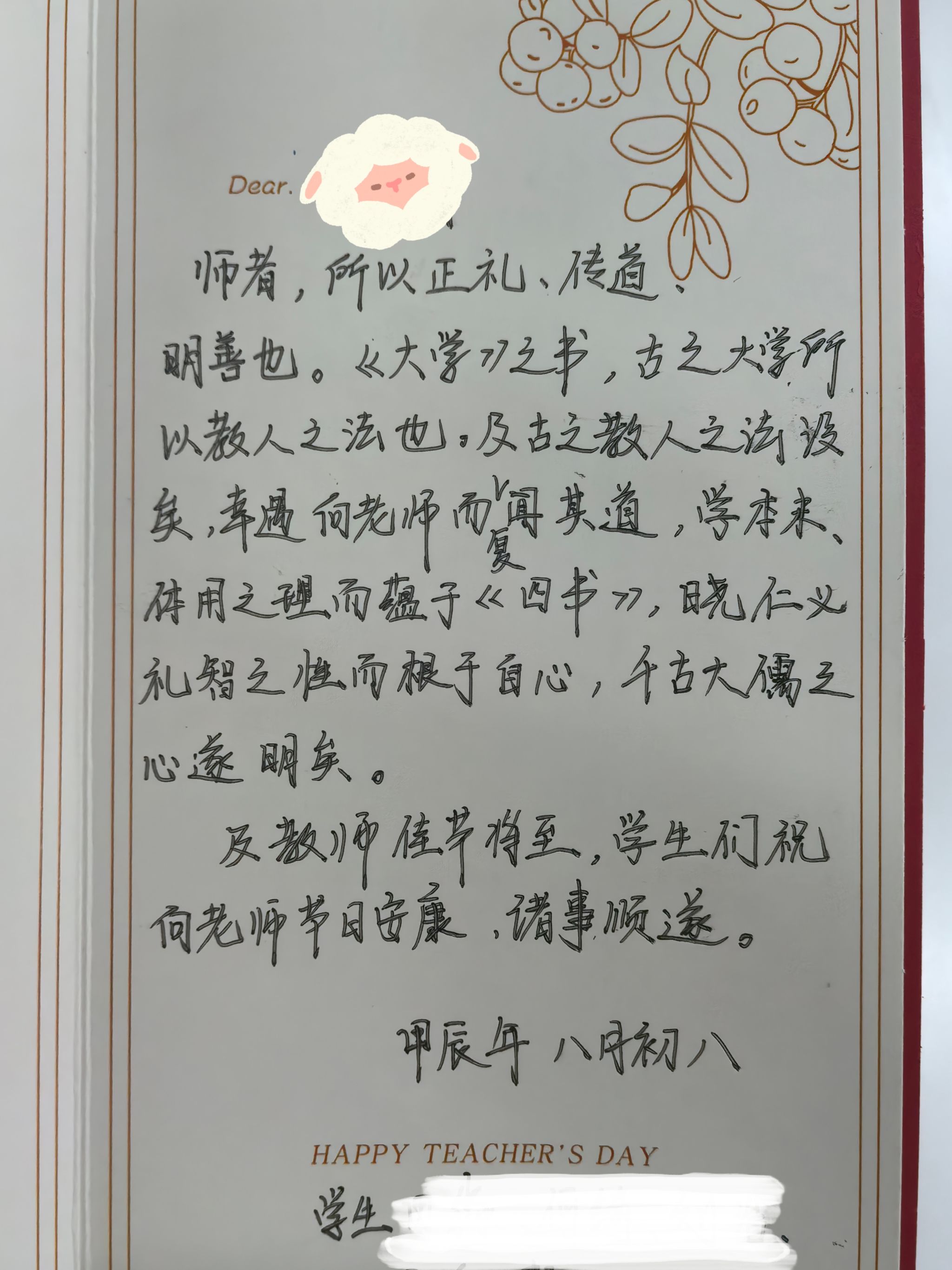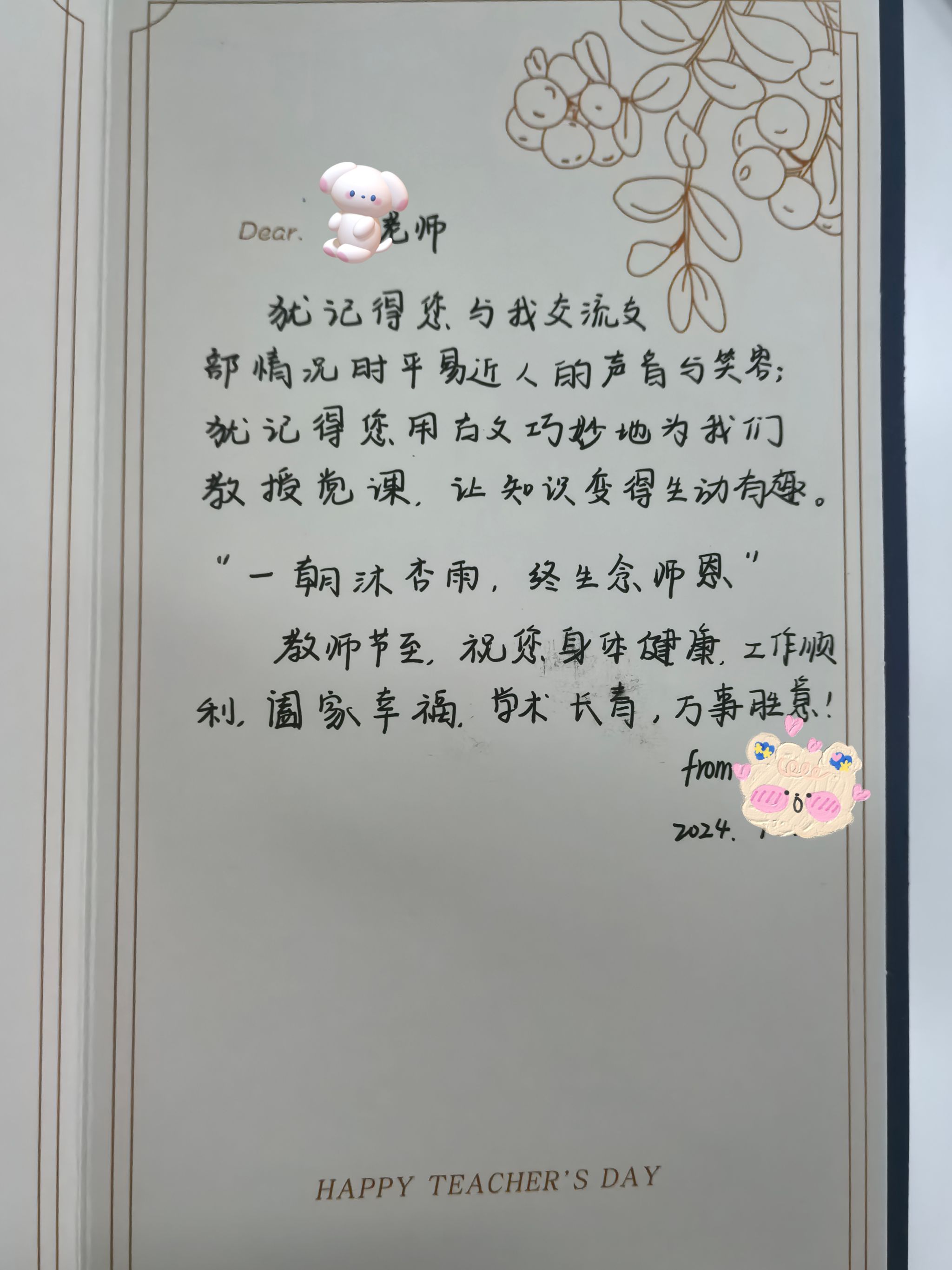 最后再次祝您教师节快乐,身体健康,学术成果丰硕。