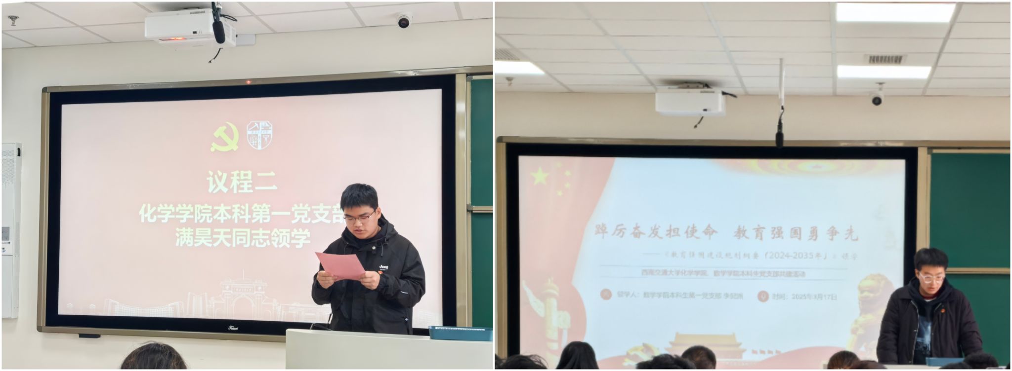 “学思想”是本科生党支部主题教育、理论学习的首要任务和第一主线,太阳成集团tyc122cc本科第一党支部的满昊天同志领学了《教育强国建设规划纲要(2024—2035年)》(以下称《纲要》),将《纲要》比作行军图,表明了深耕专业领域、担当青年使命的决心;数学公司本科生第一党支部的李倪洲同志以“踔厉奋发担使命·教育强国勇争先”为主题进行领学,勉励党员同志要在思想上、能力上、行动上发挥先锋模范作用,为强国建设、民族复兴贡献力量!