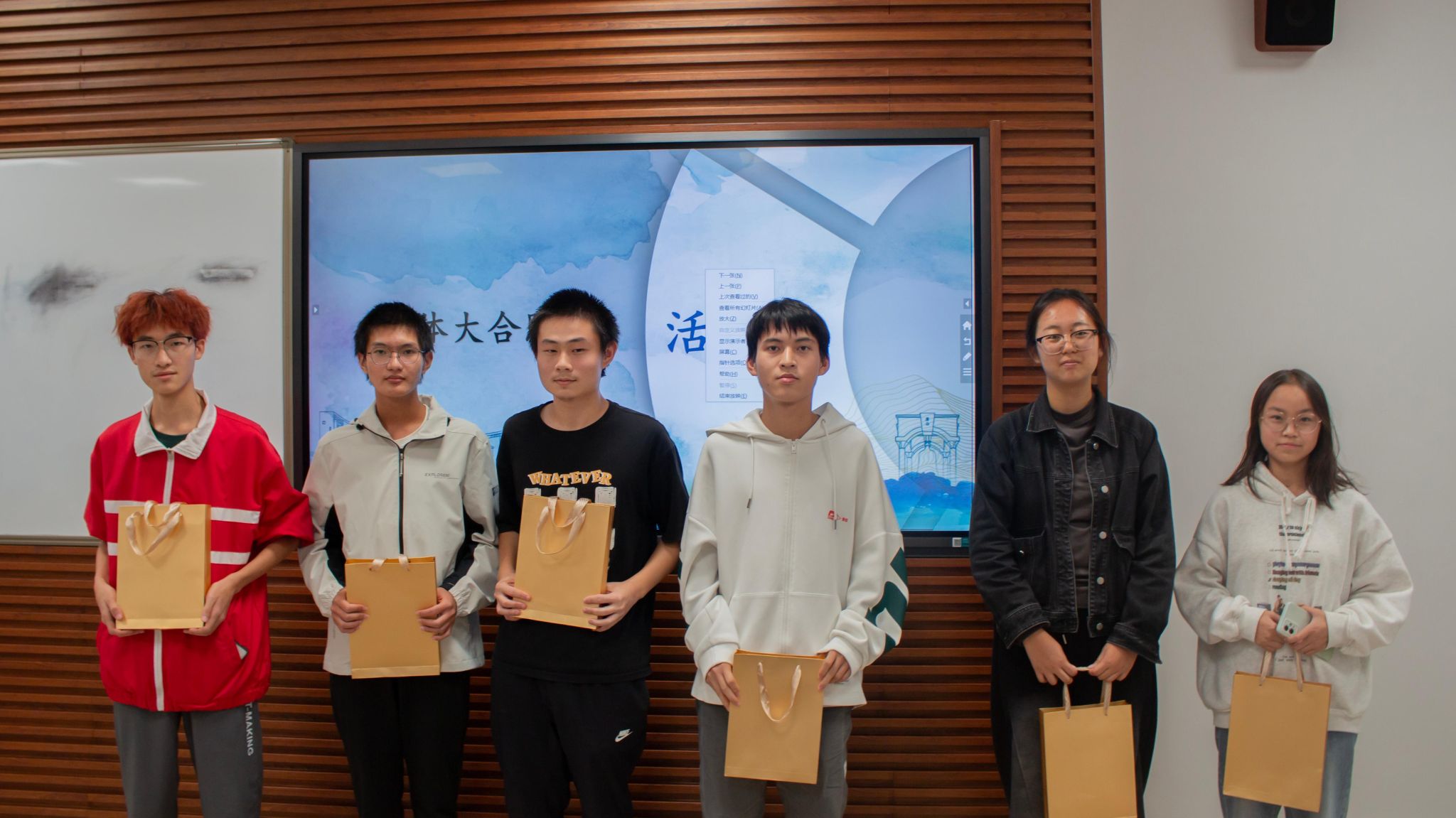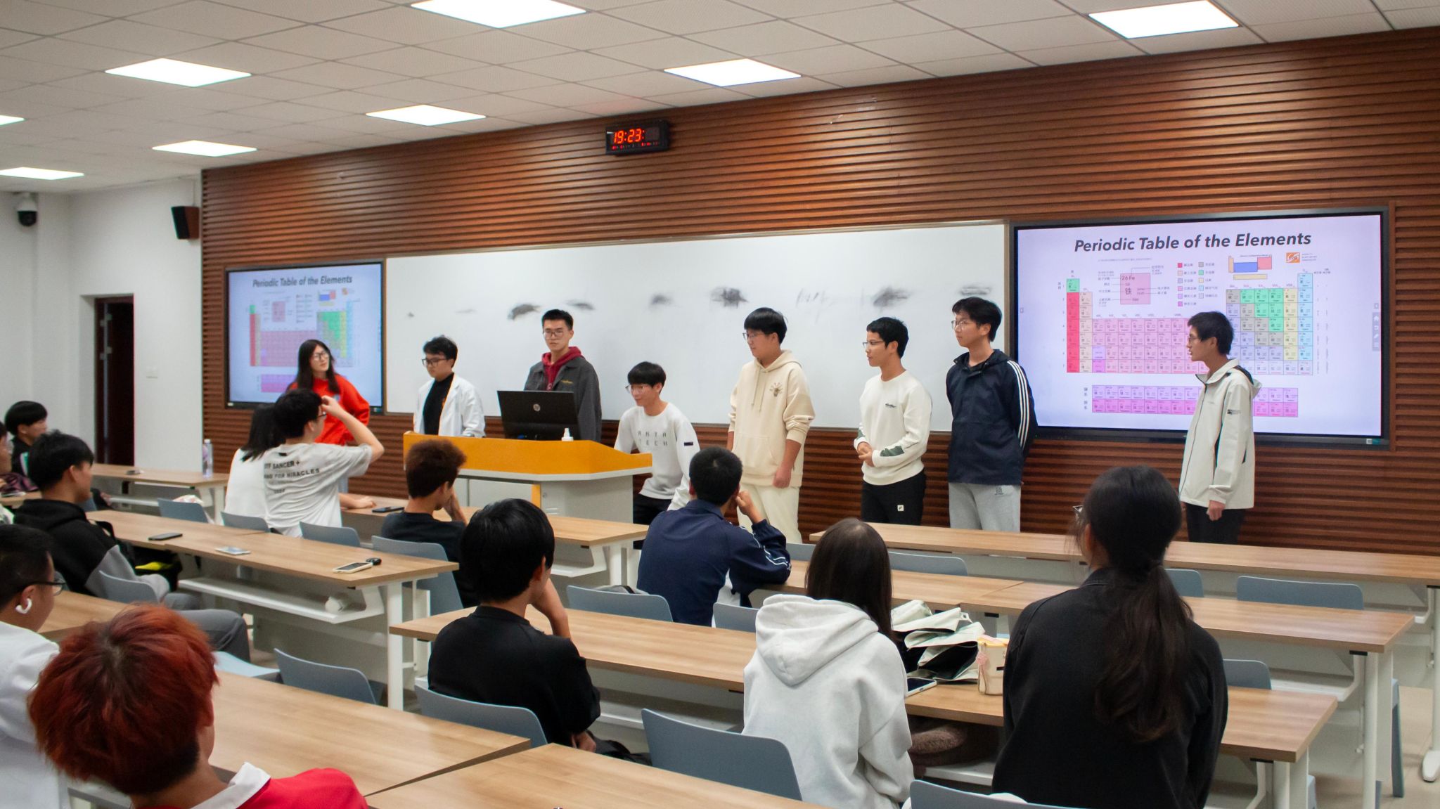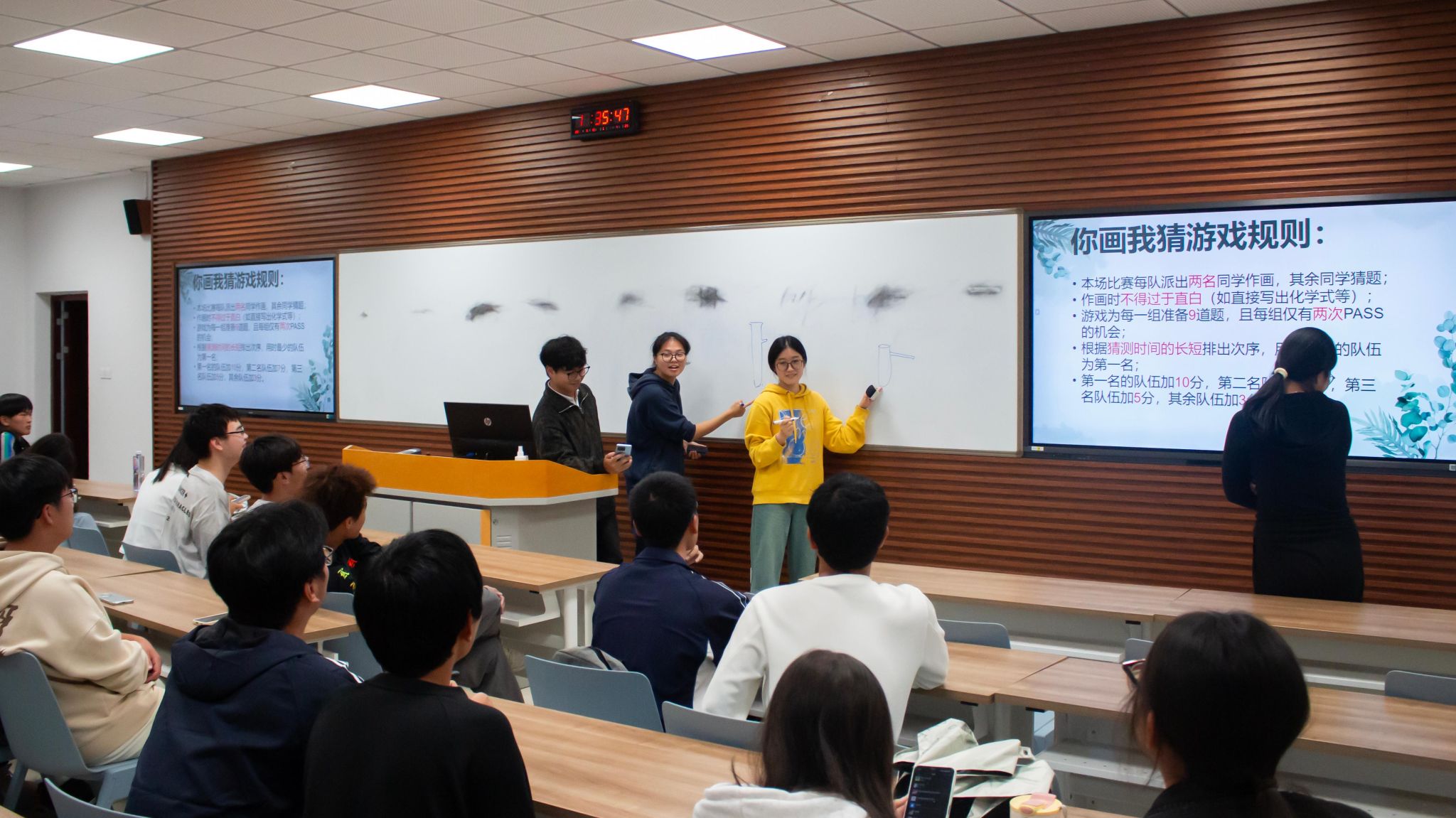 随着活动的进行,同学们越发投入其中:在你画我猜环节,同学们纷纷化为“灵魂画手”,一个个实验室常见的试剂仪器,或抽象或写实地跃然于黑板上,难记难写的名称从此深深烙印在同学们的脑海中……接下来的飞花令更是调动同学们的大脑飞速运转,来了一场诗意与化学的碰撞,诗里寻化,学蕴诗中。正话反说环节中,同学们的反应力超群,五支队伍竞争也逐渐激烈。