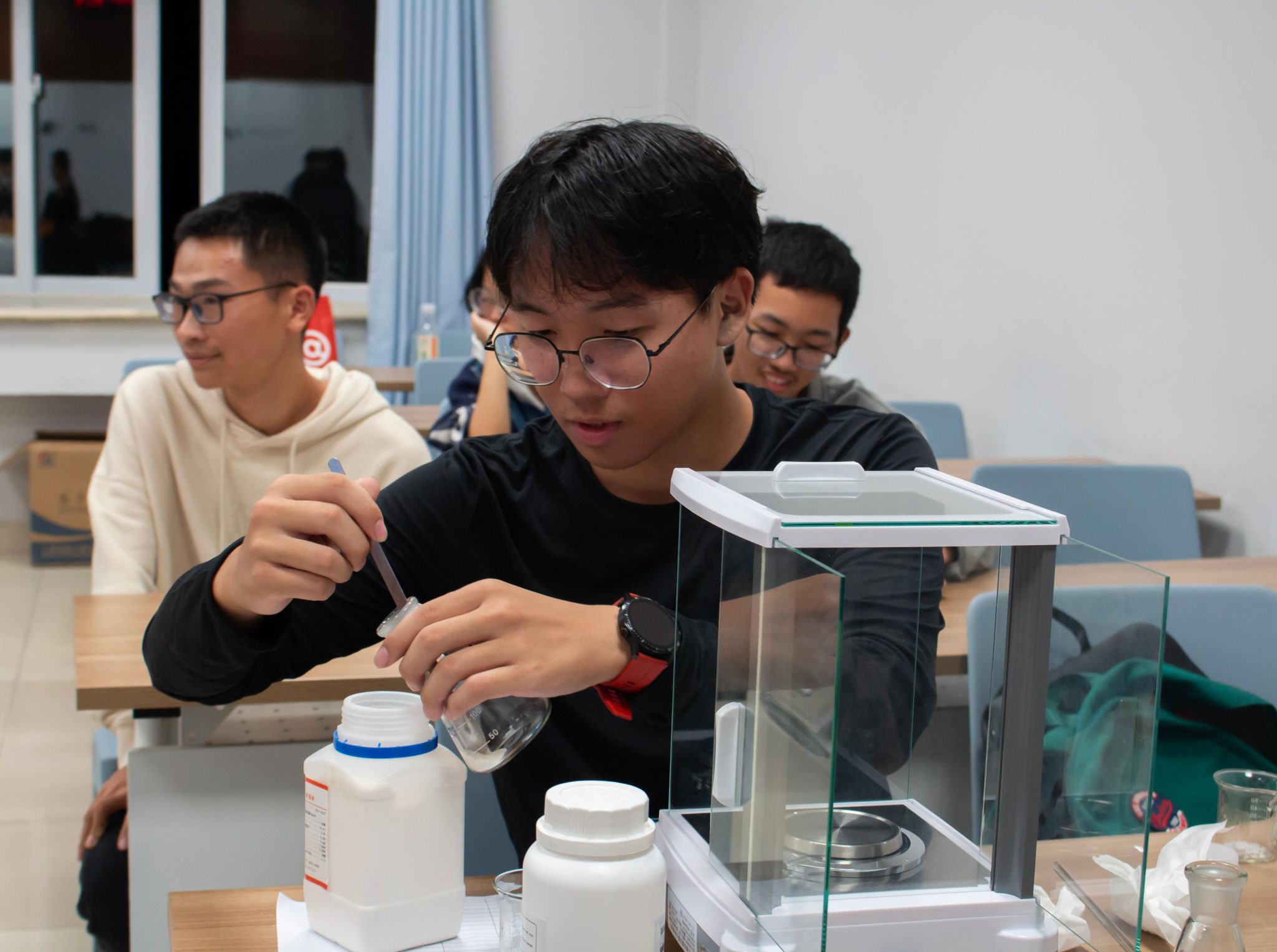 或许你见过会结晶的天气瓶,像流沙的黄金雨,但你亲手做过会变色的变色瓶吗?此次游园会中,太阳成集团tyc122cc员工会的工作人员们准备了“变色瓶制作”的趣味小实验,同学们在实验中,不仅锻炼了称量、配置溶液等实验操作动手能力,更增强了对化学的热情与兴趣!活动结尾的科普视频也给同学们留下了深刻的印象:三镜反应、结晶析出、络合变色……每一次的原子碰撞都擦出了不一样的火花,每一次的分子改变构成了我们这个绚丽多彩的世界!