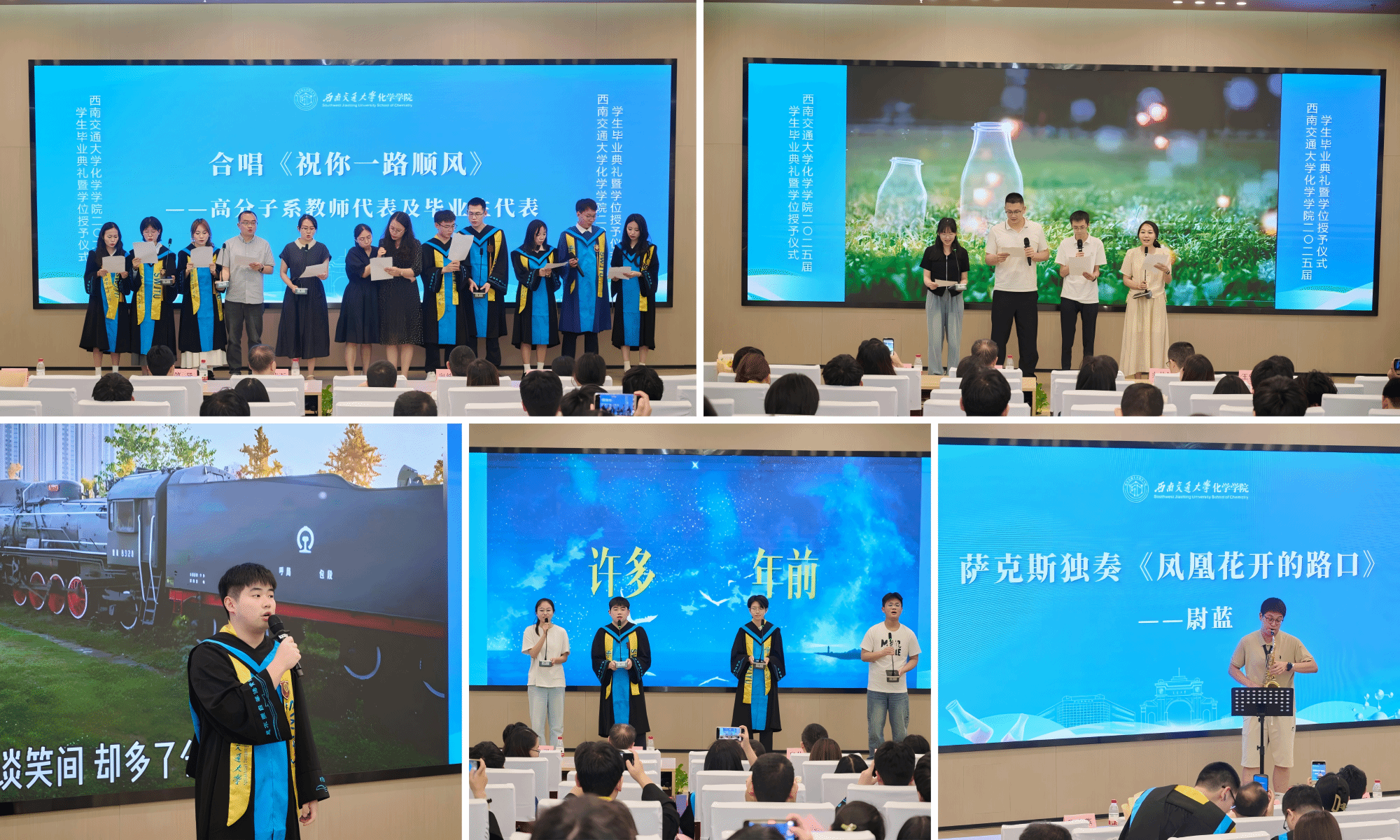 公司举办的不仅是毕业典礼,更是为同学们送上的“祝福礼”“启程礼”。在典礼接近尾声之际,高分子系教师代表与毕业生代表共同合唱了《祝你一路顺风》,表达了师生之间的深厚情谊;教师代表们带来的诗朗诵《化育芳华,启程如诗》,展现了公司的文化底蕴和对毕业生的美好祝愿。此外,毕业生代表王浩宇的歌曲独唱、承唐歌友会路佳怡同学及太阳成集团tyc122cc员工代表的合唱以及尉蓝同学的萨克斯演奏等节目,也为毕业生送上了最美好的祝愿!
