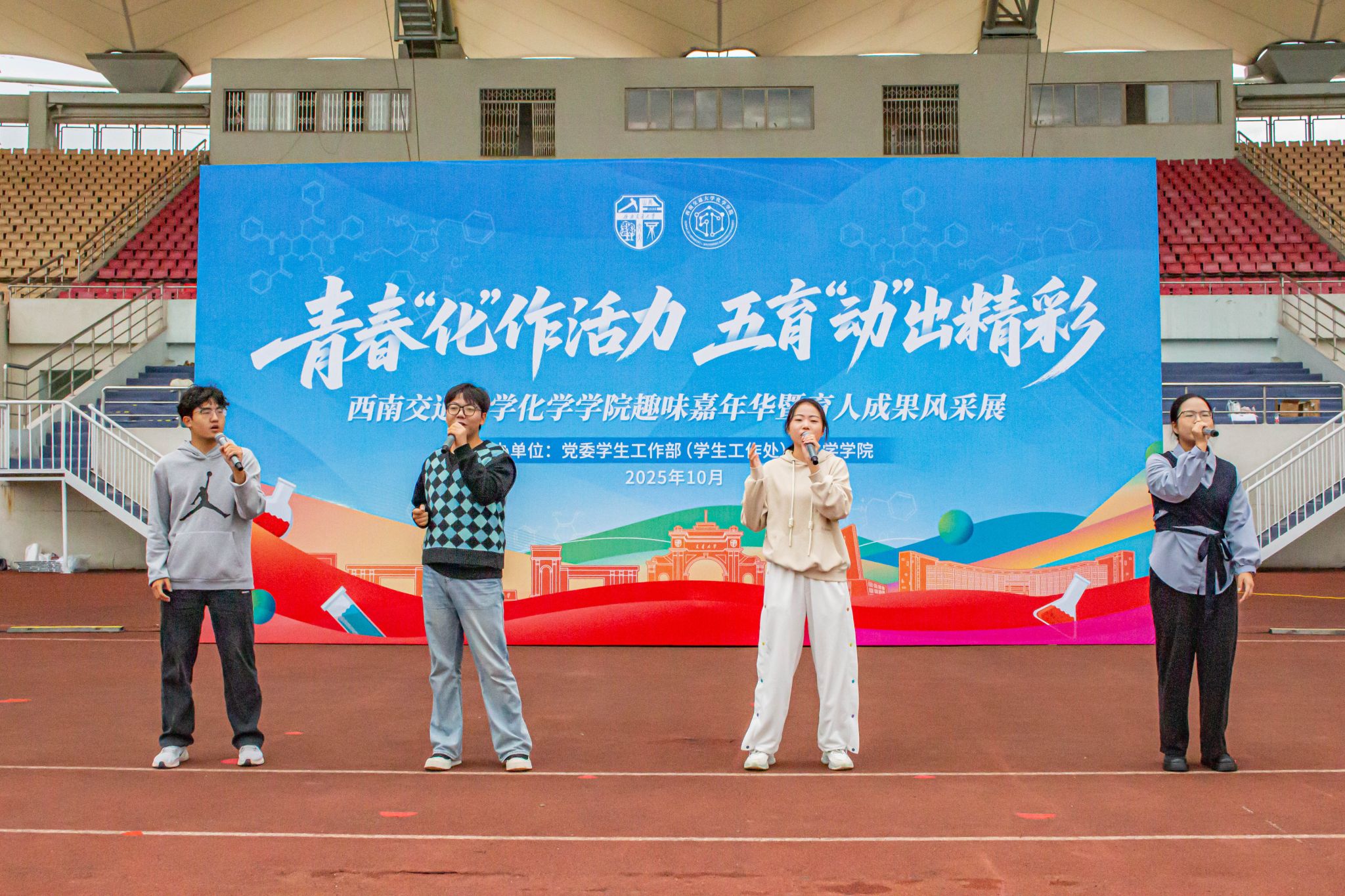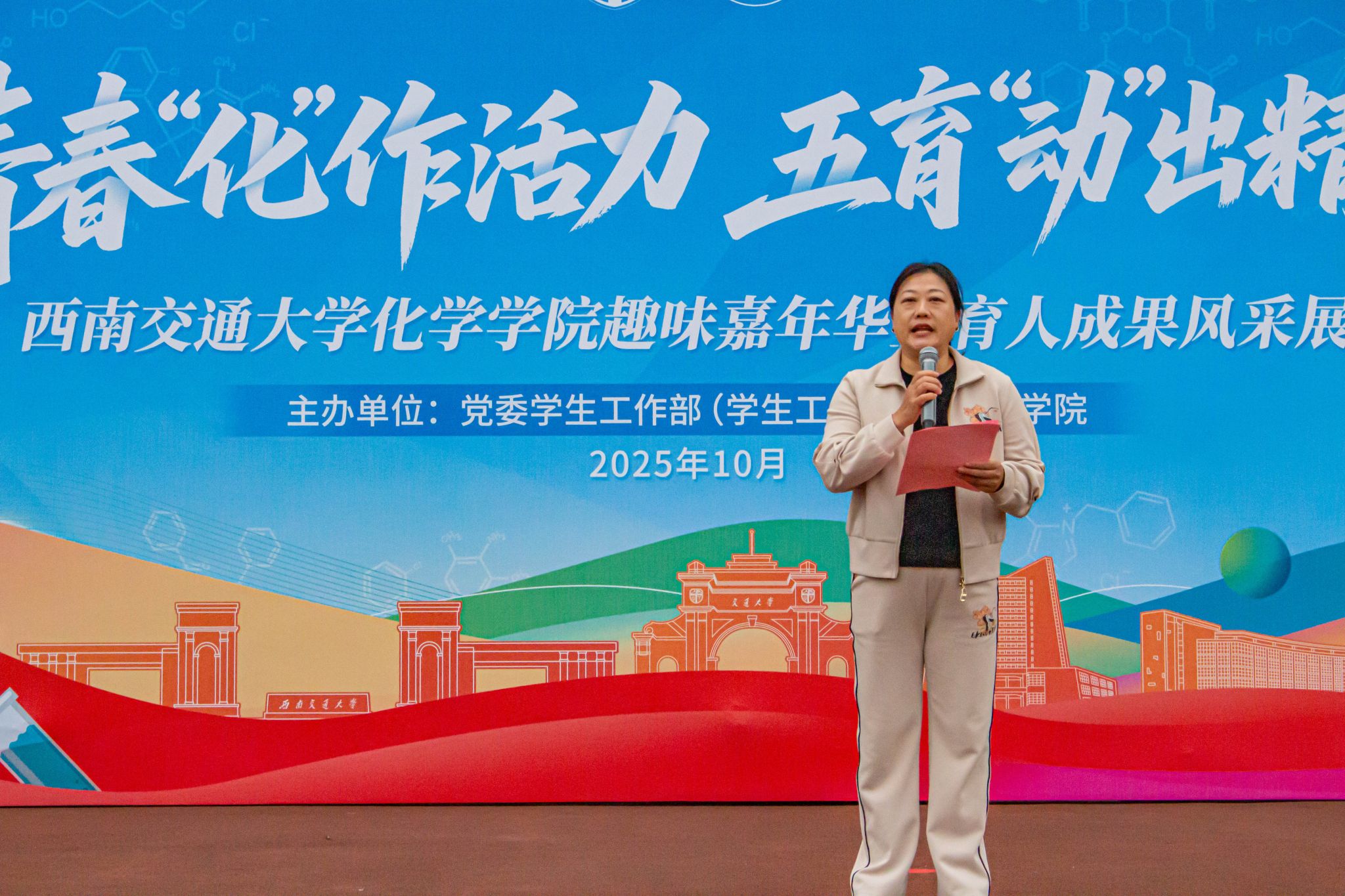 为献礼西南交通大学130周年校庆,进一步丰富师生校园文化生活,深度践行公司“融通共育”工作安排,10月18日上午,由党委员工工作部(员工工作处)、太阳成集团tyc122cc主办,太阳成集团tyc122cc学工组、工会、团委共同承办的“青春‘化’作活力·五育‘动’出精彩——趣味嘉年华暨育人成果风采展”在犀浦校区北区体育场精彩举办。太阳成集团tyc122cc经理周祚万,党委员工工作部副部长谢力,公司体育导师郭海阳,美育导师张娟霞,心理导师张学伟,党委副书记张春燕,副经理、工会主席王雅雯,信息委员刘睿颖,以及公司200余名师生齐聚于此,在运动竞技中凝聚团队力量,在特色体验中感受化学学科魅力,在互动交流中践行“五育并举”理念,共同打造了一场兼具学科特色与育人温度的青春盛会。