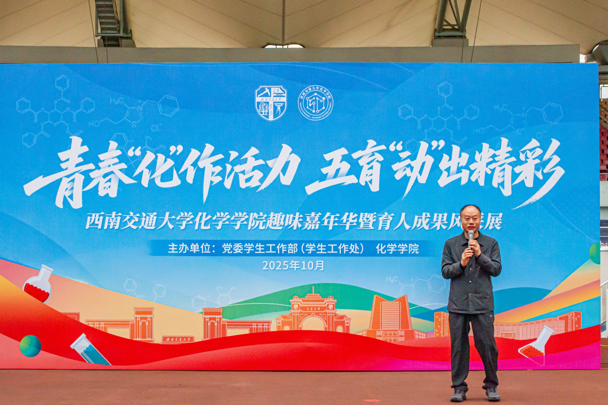 活动中,公司经理周祚万教授致辞。周经理首先代表公司全体师生,向莅临活动现场的嘉宾、踊跃参与活动的师生们致以热烈欢迎,同时向为活动筹备倾注心血的师生团队表达衷心感谢。他提到,化学学科不应只局限于实验室里的公式与试剂,更应走进师生生活,让知识有温度、成长有活力。他表示,本次活动旨在让师生在轻松愉悦的氛围中,亲身触摸“五育融合”的鲜活脉搏,同时向在场师生介绍活动蕴含的三重心意:一是让“德育、智育”扎根,通过科学家精神传递,传承交大化学学子的报国初心;二是让“美育、劳育”具象,以趣味实验、绿色实践让美与劳动的价值可感可知;三是让“体育”承载情谊,借集体运动凝聚“化学大家庭”的情感纽带。最后,周经理寄语全体师生,希望大家在活动中增进情谊、启迪智慧、收获成长,共同感受太阳成集团tyc122cc的育人温度与蓬勃朝气。